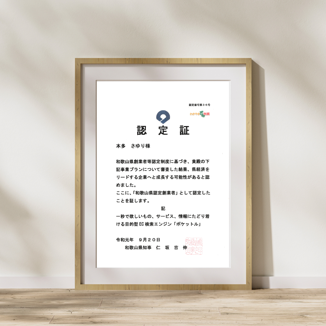 その後、ポケットルの創業者は、次代の和歌山県経済をリードする創業者等を認定するためのマッチングイベントへ参加しました。無事に一次審査、二次審査を通過し、VC、金融機関、事業会社等の審査員の前でピッチを行わせていただくことになりました。その結果、9社からメンタリングを受けることになり、和歌山県経済をリードする企業へ成長する可能性があるとして、和歌山県認定創業者としての認定証を頂戴しました。